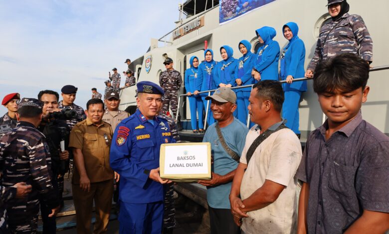 Dumai || Koranprogresif.id, Dalam rangka rangka memperingati Hari Jadi Lanal Dumai, Komandan Pangkalan TNI AL Dumai Kolonel Laut (P) Abdul Haris didampingi Ketua Jalasenastri Cabang 4 Korcab l DJA l Ny. Dewi Abdul Haris mengadakan Bakti Sosial di Perairan Sei Dumai, Selasa (18/03/2025).