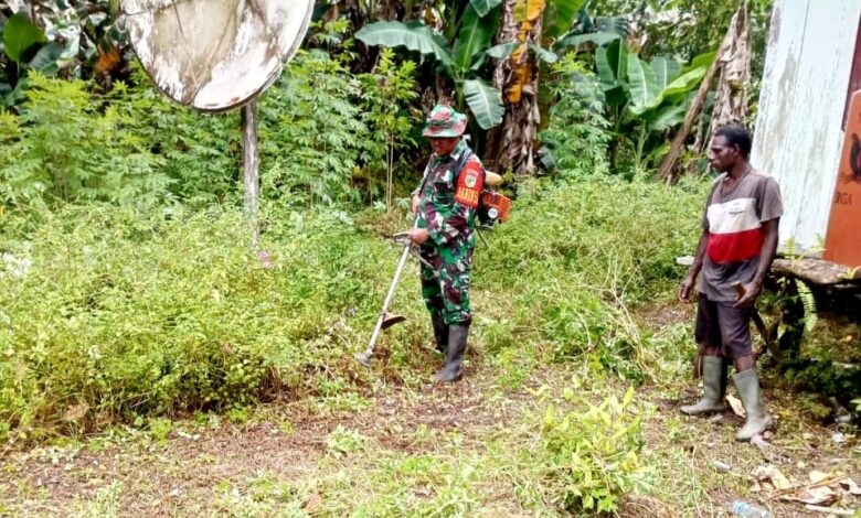 Anggota Pos Ramil Jita Koramil 1710-06/Agimuga Melaksanakan Pembersihan Pangkalan