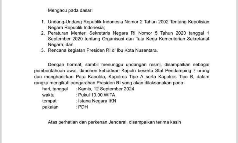 Diketahui, pengarahan di IKN Nusantara ini akan dihadiri oleh para Kapolda, Kapolrestabes, Kapolresta, Kapolres, serta panglima dan komandan dari Komando Utama (Kotama) TNI dari seluruh Nusantara. Mereka akan mendapatkan pengarahan khusus dari Presiden Joko Widodo, didampingi oleh Panglima TNI, Jenderal TNI Agus Subiyanto dan Kapolri, Jenderal Pol Listyo Sigit Prabowo di Istana IKN.