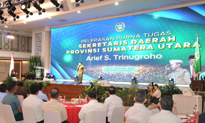 Pj. Gubernur Sumatera Utara Dr. Drs. Agus Fatoni menyampaikan selamat memasuki purna tugas kepada Arief S. Trinugroho sebagai Sekda Provinsi Sumut periode 2022-2024. Terima kasih atas pengabdian selama ini di Provinsi Sumatera Utara. Bapak selalu melaksanakan tugas pengabdian dengan penuh dedikasi dan tanggung jawab. Ini suatu sikap yang harus diteladani oleh seluruh aparatur pemerintahan khususnya di lingkungan Provinsi Sumatera Utara.
