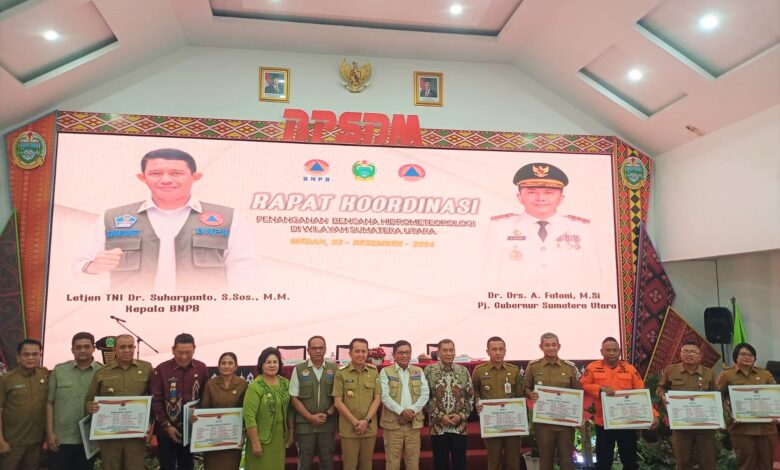 Kegiatan Rakor tersebut dipimpin oleh Pj. Gubernur Sumut Dr. Drs. Agus Fatoni, M.Si., dan dihadiri oleh Sekretaris Utama BNPB Rustian, S.Si., Apt., M.Kes., serta perwakilan Komisi VIII DPR RI H. Azhari Tambunan.