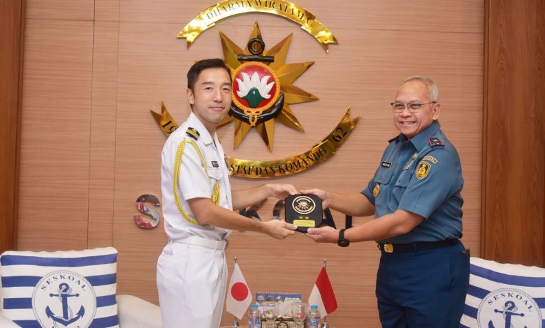 Komandan Sekolah Staf dan Komando Angkatan Laut (Danseskoal) Laksamana Muda TNI Ariantyo Condrowibowo yang diwakili Wadan Seskoal Laksamana Pertama TNI Agoeng MKS menerima kunjungan Atase Pertahanan (Athan) Jepang Captain (N) Hamakawa Sho bersama Pasis Dikreg Seskoal angkatan ke-63 TA 2025 CDR Otsuka Hideo, JMSDF, bertempat di ruang VIP gedung Samadikun Seskoal, Cipulir, Kebayoran Lama, Jakarta Selatan, Selasa (22/7/2025).