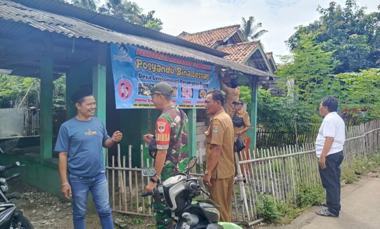 Babinsa Desa Lembang Sari Bantu Pemasangan Banner PMT, Entaskan Anak Kurang Gizi