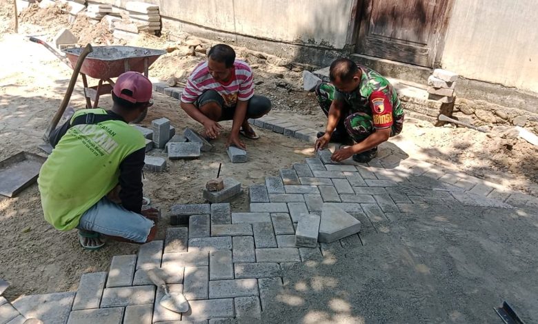 Babinsa Kodim Ponorogo Ikut Gotong-Royong Pasang Paving Block Jalan