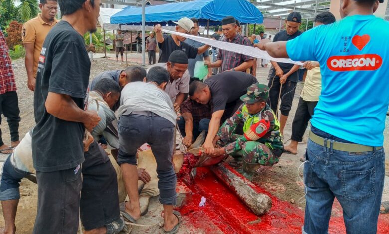 Aceh Barat || Koranprogresif.id, Babinsa Koramil 02/Woyla Kodim 0105/Abar Koptu M.Fadli Moment Saat Lebaran Idul Adha 1446 H Babinsa Membantu pemotongan hewan kurban di Desa Kuala Bhee Kec.Woyla Kab.Aceh Barat Sabtu, (07/06/2025)