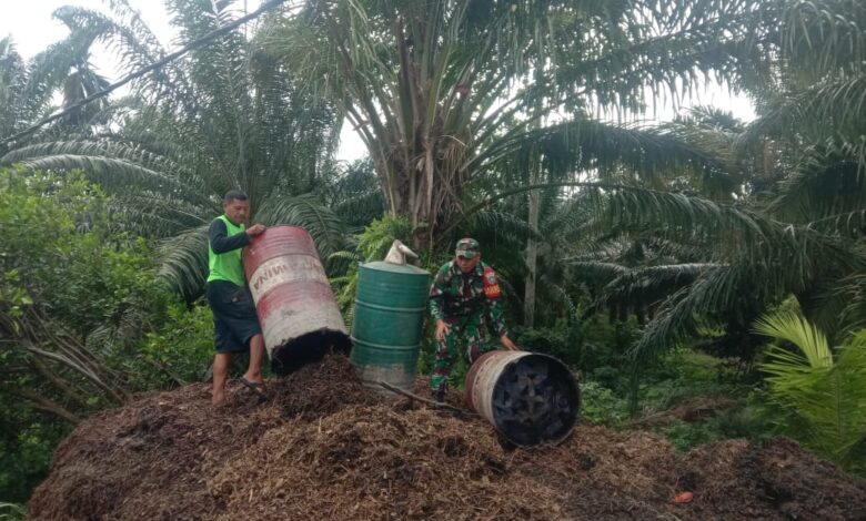 Babinsa Serda Edi turut serta dalam membantu warga membongkar ampas nilam yang telah disuling, yang nantinya akan digunakan sebagai pupuk organik atau bahan bakar alternatif.