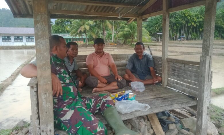 ACEH SELATAN – Sebagai wujud komitmen TNI dalam mendukung program ketahanan pangan nasional, Babinsa Koramil 11/Kluet Tengah Koptu Ali melaksanakan kegiatan diskusi bersama para petani di pondok sawah bertempat di Desa Mersak Kecamatan Kluet Tengah, Kabupaten Aceh Selatan, Minggu (13/7/2025).