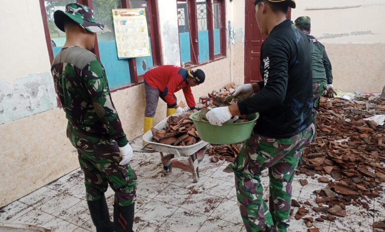Babinsa Koramil 19 Trucuk Gotong Royong Pembersihan Gedung SDN 2 Pundungsari Yang Roboh