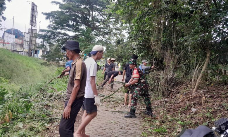 Babinsa Mekarsari Bersama Warga Kerja Bakti Bersihkan Semak di Bantaran Kali