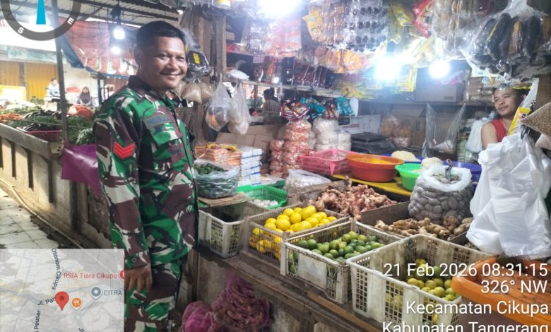 Tigaraksa – Aparat teritorial TNI Angkatan Darat melalui Bintara Pembina Desa (Babinsa) Kopka Dewa Koramil 04/Cikupa melakukan monitoring harga pangan di Pasar Tradisional Cikupa RT 02/01 Desa Cikupa, Kec Cikupa, Kab Tangerang, Sabtu (21/2/2026), sebagai bagian pengendalian inflasi daerah dan menjaga stabilitas pasokan masyarakat.