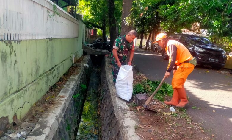 Babinsa Sertu Didin membantu PPSU melakukan pembersihan saluran air d jalan dengan menggunakan alat peralatan manual