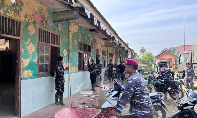 Aceh Tamiang || Prajurit Batalyon Infanteri 8 Marinir yang tergabung dalam Satuan Tugas (Satgas) Penanggulangan Bencana Kodaeral I melaksanakan aksi tanggap darurat dengan membantu membersihkan pembersihan sarana pendidikan di berbagai Sekolah Dasar di Aceh Tamiang, salah satunya di SDN 1 Tualang Cut Kec. Manyak Payed Kab. Aceh Tamiang. Aceh. Kegiatan ini difokuskan pada pembersihan material lumpur tebal serta tumpukan sampah yang terbawa arus ke dalam ruang kelas dan halaman sekolah. Kamis, (22/01/2026).