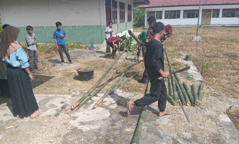 Simeulue || Koranprogresif.id, Babinsa Koramil 05/Simbar Sertu Rosihan Cahyadi melaksanakan gotong royong dengan siswa-siswi yang sedang membersihkan rumput-rumput liar di halaman sekolah serta membuat pagar dari bambu untuk memperbarui pagar sekolah yang telah rusak, bertempat di SMPN 5 Simeulue Barat, Selasa (20/05/2025).
