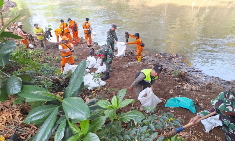 Kegiatan karya bakti pembersihan sampah organik dan anorganik yang ada di bantaran aliran sungai Ciliwung dari sampah yang menumpuk serta menghambat laju air sungai Ciliwung oleh personel Babinsa bersama warga dan aparat terkait Tiga pilar Kelurahan Cililitan.