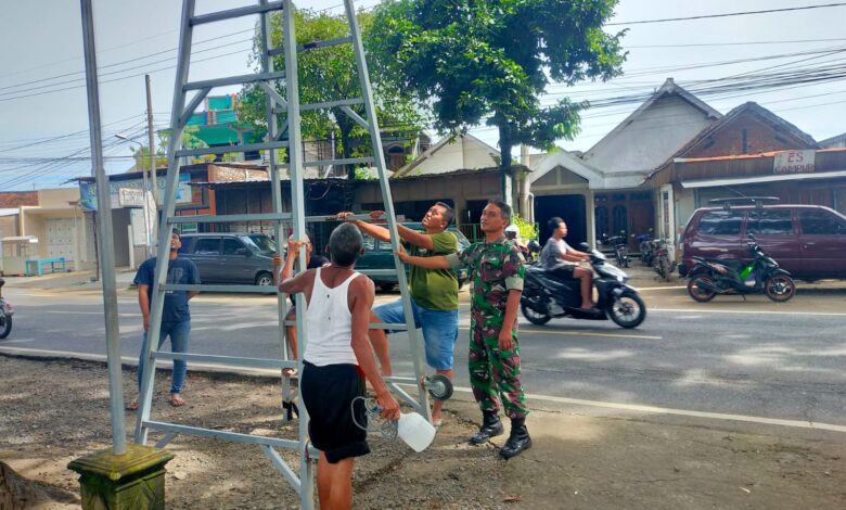 Binter, Anggota Kodim Ponorogo Bantu Warga Perbaiki Lampu Penerangan Jalan