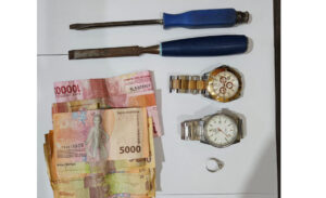 “Saat ditangkap, dari rumah kontrakan tersangka petugas mengamankan barang bukti 1 buah jaket switer dan celana yang dipakai waktu kejahatan terekam yang CCTV, uang tunai sisa hasil kejahatan Rp 285.000 ribu, 2 buah jam tangan dan cincin emas seberat 2,5 Gram,” terang Kapolsek.