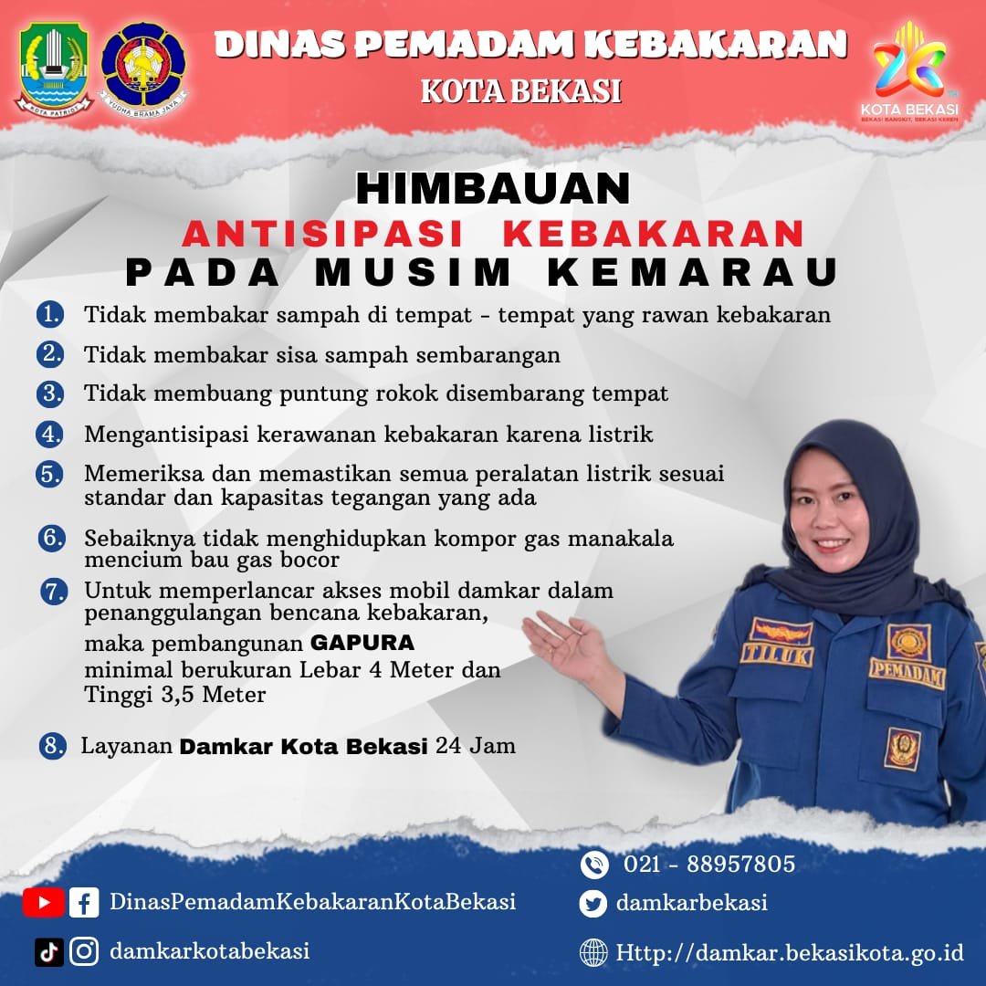 Kota Bekasi – koranprogresif.co.id – Dinas Pemadam Kebakaran (Damkar) Kota Bekasi mengimbau masyarakat untuk meningkatkan kewaspadaan terhadap ancaman kebakaran selama musim kemarau.