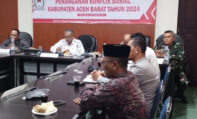 Secara spesifik, Sekdakab Marhaban, S.E., M.Si., menguraikan bahwa pokok permasalahan konflik sosial yang menonjol saat ini diantaranya kondisi politik menjelang Pilkada serentak 2024, pembakaran Barak koperasi oleh masyarakat Desa Teumarom Kecamatan Woyla, pencemaran limbah Batubara di Pantai Peunaga Pasi Kecamatan Meureubo, maraknya gangguan Gajah liar dibeberapa Kecamatan yang ada di wilayah Kabupaten Aceh Barat dan penolakan warga Dusun Manggis Desa Ujong Baroh Kecamatan Johan Pahlawan terhadap keberadaan Pasar Ayam potong.