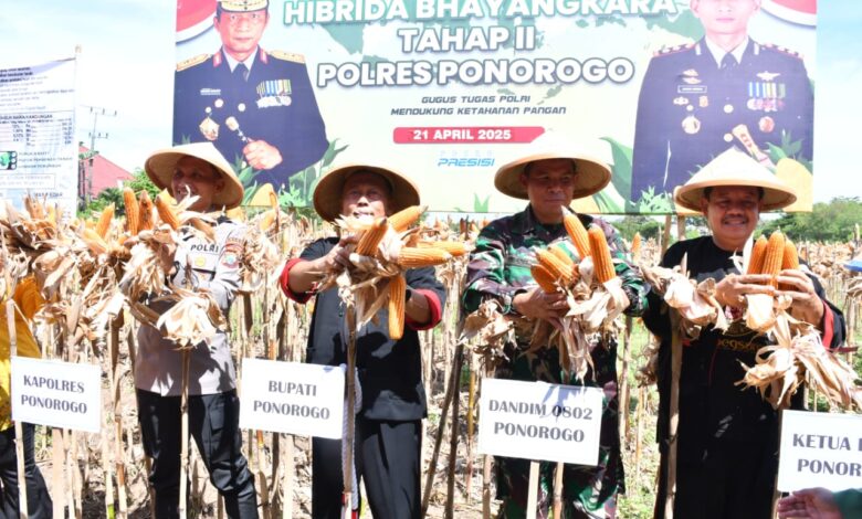 “Panen Raya Jagung Hibrida Bhayangkara Tahap II oleh Polres Ponorogo ini, merupakan langkah yang sangat bagus dan harus kita dukung terus guna suksesnya program Pemerintah terkait Ketahanan Pangan Nasional,” kata Dandim Ponorogo.