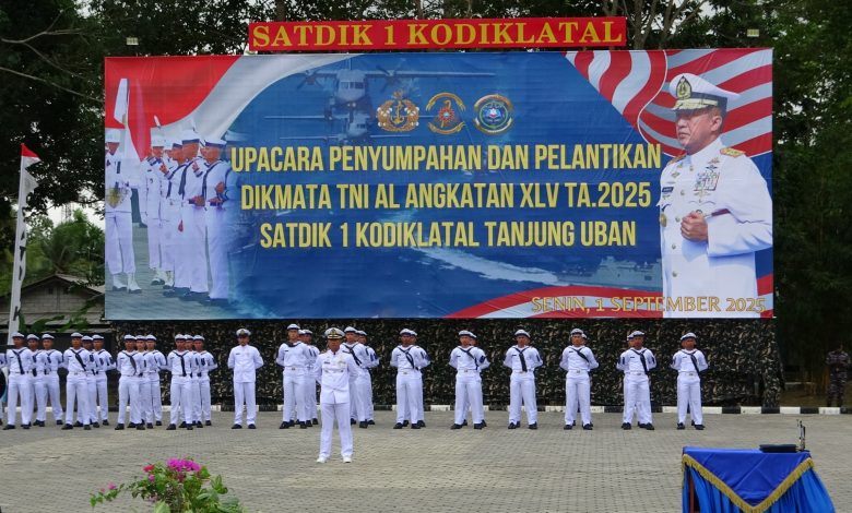 Bintan,- Komandan Lanal Bintan Kolonel Laut (P) Dr. Eko Agus Susanto, S.E., M.M., hadir pada Upacara Pelantikan dan Penyumpahan Siswa Dikmata TNI AL Angkatan 45 Satdik I Kodiklatal yang dipimpin oleh Komandan Kodiklatal Letnan Jenderal TNI (Mar) Nur Alamsyah, S.E., M.M., M.Tr (Han), bertempat di Tanjung Uban, Bintan, Senin (01/09/2025).