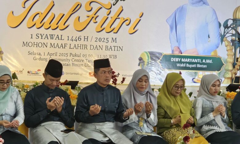 Bintan || Koranprogresif.id, Bertempat di Gedung Nasional Tanjung Uban Bintan, Komandan Lanal Bintan Kolonel Laut (P) DR. Eko Agus Susanto, S.E., M.M., yang didampingi Ketua Cabang 5 Korcab IV DJA I Ny. Erni Eko Agus Susanto menghadiri Open House yang diselenggarakan oleh Bupati dan Wakil Bupati Bintan 1446 H/2025 M, Selasa (01/04/2025).