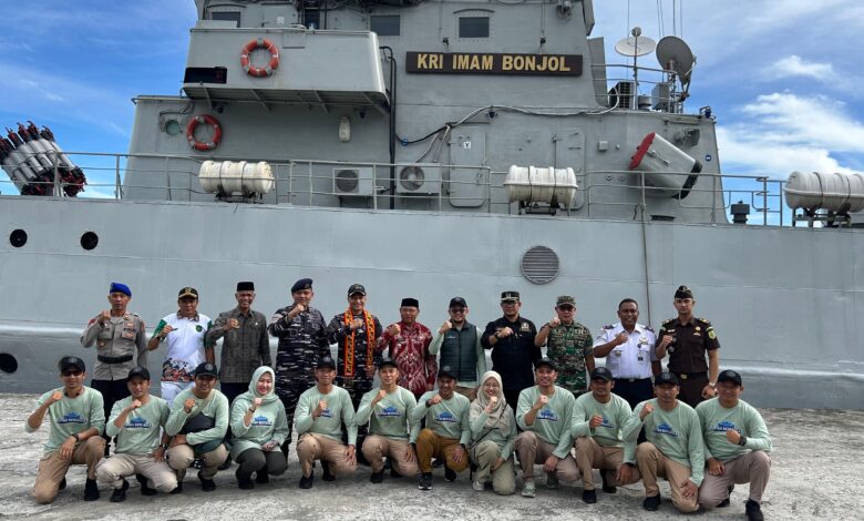 Simeulue || Koranprogresif.id, Komandan Pangkalan TNI AL Simeulue beserta Forkopimda Kabupaten Simeulue menyambut kedatangan Kapal Perang Republik Indonesia (KRI) Imam Bonjol-383 dalam rangka pelaksanaan Ekspedisi Rupiah Berdaulat (ERB) Tahun 2025 di Pelabuhan Laut Sinabang, Desa Suka Jaya, Kecamatan Simeulue Timur, Kabupaten Simeulue, Jumat (13/6/2025).