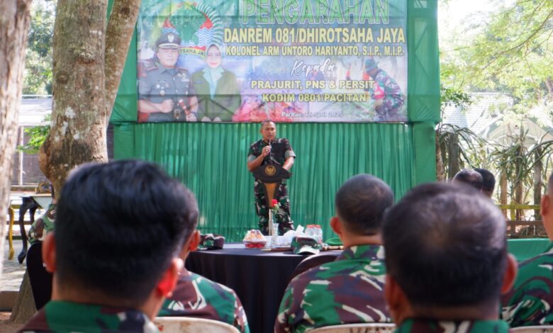 PACITAN || Koranprogresif.id – Danrem 081/DSJ, Kolonel Arm Untoro Hariyanto menghendaki agar anggotanya bisa kreatif untuk mendapatkan penghasilan tambahan bagi keluarga. Namun, ia menekankan agar tidak menghalalkan segala cara yang salah satunya dengan menjadi backing perjudian.
