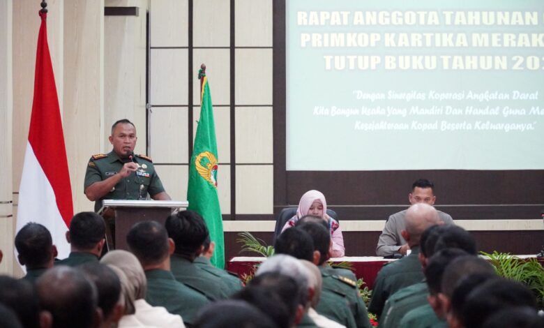 MADIUN || Koranprogresif.id – Danrem 081/DSJ, Kolonel Arm Untoro Hariyanto memimpin Rapat Anggota Tahunan (RAT) Primkop Merak Jaya Tutup Buku Tahun 2024, bertempat di Aula Jenderal Sudirman Makorem, Jl. Pahlawan No. 50 Kota Madiun, Selasa (11/3/2025).