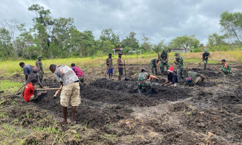 Merauke – Suasana penuh semangat mewarnai Kampung Rawabiru, Distrik Sota, Kabupaten Merauke, saat sembilan Prajurit Satgas Yonif 312/KH yang dipimpin oleh Serka Asep Hari Mulyana bergotong royong bersama masyarakat dalam kegiatan ketahanan pangan berupa pembuatan bedeng. Kegiatan ini dilakukan di lahan kosong yang telah disiapkan bersama, pada Rabu (30/4/2025).