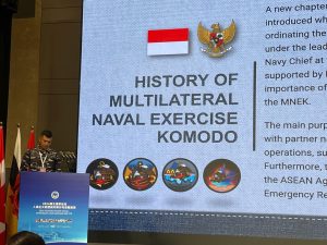 Letkol Laut (P) Eko Darmawan yang menjabat sebagai Komandan KRI SNU-373 dibawah komando Satkor Koarmada II, mendapat kesempatan memaparkan tentang pelaksanaan Latihan Multilateral yang bertemakan HADR yaitu Latma Multilateral Naval Execise Komodo (MNEK) yang telah terlaksana selama empat (4) series dan series ke-lima (5) akan dilaksanakan pada bulan Februari 2025 di Bali.