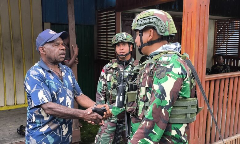 Puncak Jaya – Satgas Pamtas Kewilayahan Yonif 715/Motuliato melakukan kegiatan Komunikasi Sosial (Komsos) untuk membantu kesulitan dan mendengarkan keluhan masyarakat binaan di sekitar Distrik Mulia, Puncak Jaya, Papua Jumat (28/02/2025).