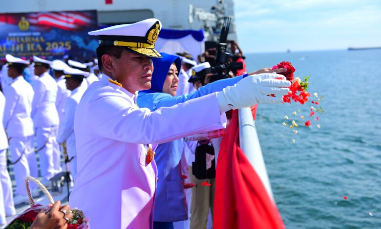 Jakarta || Koranprogresif.id, 15 Januari 2025 , Kepala Staf Angkatan Laut (Kasal) Laksamana TNI Dr. Muhammad Ali, S.E., M.M., M.Tr.Opsla memimpin upacara tabur bunga di perairan teluk Jakarta dalam rangka memperingati Hari Dharma Samudera Tahun 2025 dari geladak utama KRI dr. Radjiman Wedyodiningrat (992) yang bertolak dari Dermaga Markas Besar Komando Lintas Laut Militer (Kolinlamil), Jakarta, Rabu (15/1). Hadir dalam upacara tersebut Para Pejabat Utama Mabesal dan Pimpinan Kotama TNI AL diikuti Ketua Umum Jalasenastri Ny. Fera Muhammad Ali beserta Pengurus Inti Jalasenastri.