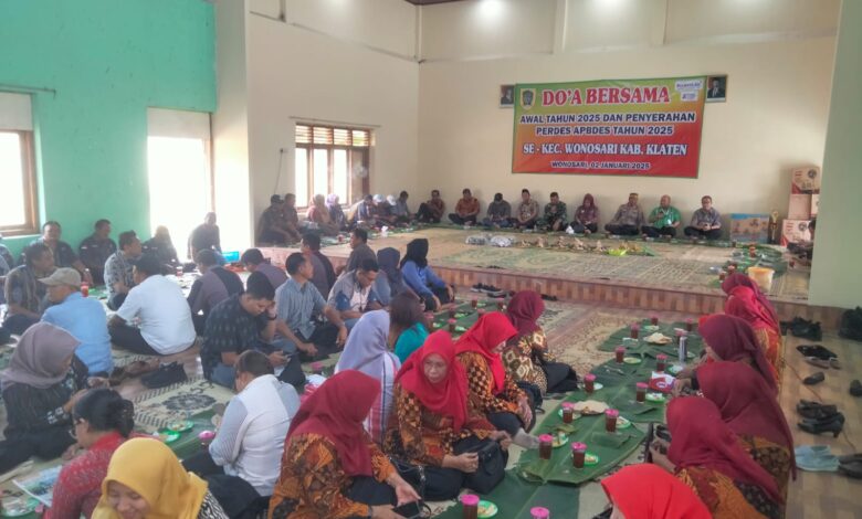Klaten || Koranprogresif.id, Dalam rangka menyambut Tahun 2025, Kapten Inf Purwanto, Danramil 22 Wonosari Kodim 0723 Klaten, bersama jajaran Forkopimcam Wonosari, menghadiri acara Doa Bersama dan Penyerahan Peraturan Desa (Perdes) APBDes Tahun 2025 di Gedung BPLLKMD Kecamatan Wonosari Kabupaten Klaten pada Kamis, (2/1/2025)
