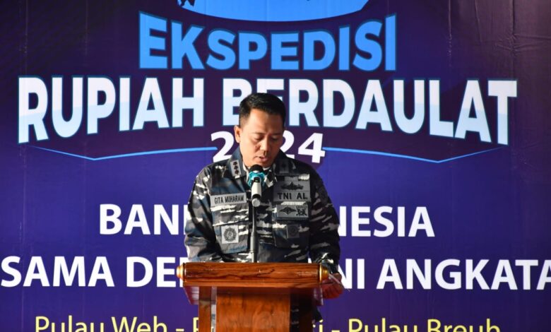 Sabang || Koranprogresif.id, Dalam rangka mensukseskan Program Pemerintah, berupa kegiatan Ekspedisi Rupiah Berdaulat tahun 2024 di Provinsi Aceh, Komandan Lanal Sabang (Danlanal Sabang) beserta unsur Forkopimda Sabang menghadiri sekaligus memberikan sambutan sebagai tanda dimulainya kegiatan Ekspedisi Rupiah Berdaulat (ERB), bertempat di Gedung Satbek Lanal Sabang, Jalan Kuta Barat, Kecamatan Sukakarya, Kota Sabang, Jumat (20/09/2024).