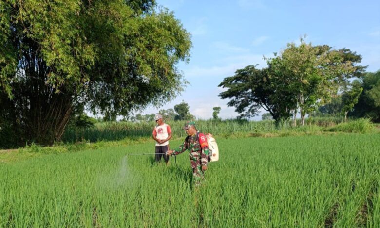 TULUNGAGUNG || Koranprogresif.id – Dalam upaya mendukung program swasembada pangan nasional, Babinsa Bendiljati Wetan, Serma Agus Prasetiyo, anggota Koramil 0807/07/Sumbergempol, melaksanakan kegiatan pendampingan pertanian dengan membantu penyemprotan pupuk daun pada tanaman padi milik warga binaan anggota Kelompok Tani Karto Nuju Raharjo yang berada di Desa Bendiljati Wetan, Kecamatan Sumbergempol, Kabupaten Tulungagung, Jawa Timur, Kamis (19/06/2025).