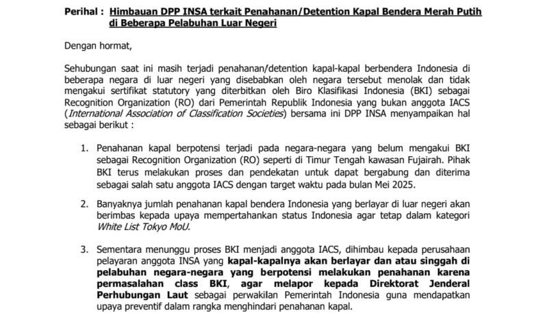 Hal ini juga diperkuat adanya Himbauan dari Organisasi Indonesian National Shipowners Association (INSA) melalui suratnya nomor: 324/ORTA/VIII/2024 tertanggal 23 Agustus 2024 Perihal Himbauan DPP INSA terkait Penahanan/Detention Kapal Bendera Merah Putih di Beberapa Pelabuhan Luar Negeri, hal ini disebabkan ternyata BKI bukan anggota IACS (International Associstion of Clasification Societies ) sehingga Negara tersebut menolak setifikat statuory sebagai Recognition Organization ( RO ).