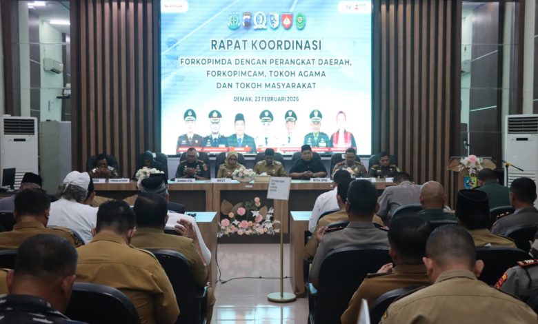 DEMAK || Koranprogresif.id – Komitmen pemberantasan penyakit masyarakat dan penguatan stabilitas keamanan selama Ramadhan hingga Idul Fitri 1447 H menjadi penekanan utama dalam Rapat Koordinasi Lintas Sektoral Forkopimda Kabupaten Demak bersama perangkat daerah, Forkopimcam, tokoh agama, dan tokoh masyarakat di Gedung Grhadika Bina Praja Demak, Senin (23/2/2026).