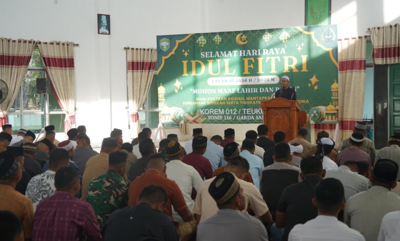 Shalat Idul Fitri 1446 H/2025 ini diakhiri dengan momen saling bermaaf-maafan. Acara ini dihadiri oleh Danyonif 116/GS Letkol Inf Novy Widyanto, para Kasi Korem 012/TU, para Dan/Ka Balak Rem 012/TU, prajurit dan PNS Korem 012/TU, serta masyarakat sekitar Komplek Korem 012/TU.