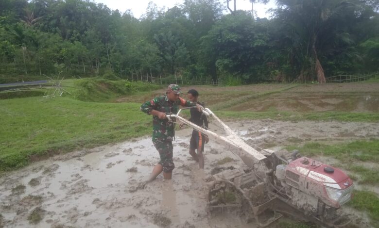 Gunakan Mesin Traktor, Babinsa Teupah Barat Bantu Petani Bajak Sawah