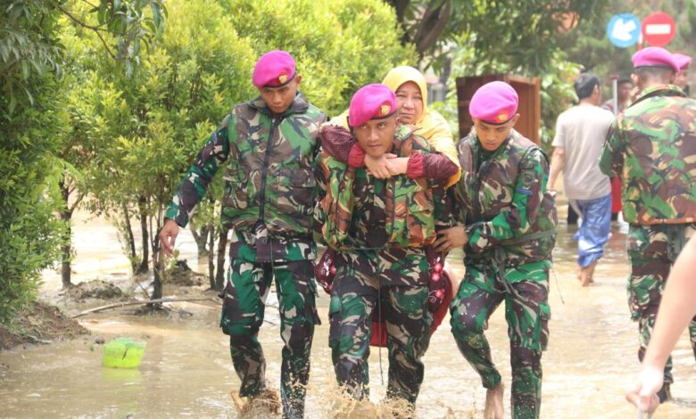 JAKARTA || Koranprogresif.id – Memasuki hari kedua bencana banjir di daerah Jabodetabek, TNI AL masih menerjunkan Prajurit Korps Marinir untuk mengevakuasi warga dan membersihkan sisa-sisa lumpur dan kotoran limbah banjir yang masuk ke rumah-rumah masyarakat, Rabu (5/3).