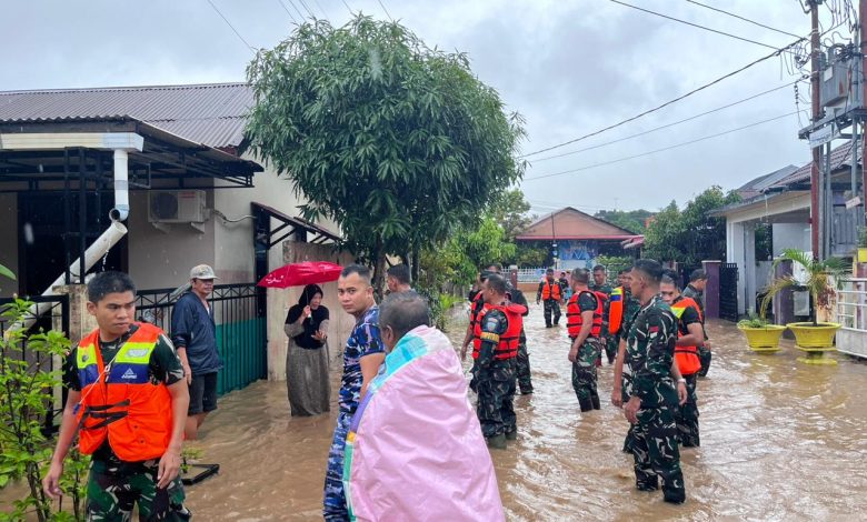 Padang – TNI kembali menunjukkan kesiapsiagaan dalam membantu masyarakat dengan mengerahkan prajurit Lanud Sutan Sjahrir untuk mengevakuasi warga terdampak banjir di Kelurahan Bungo Pasang dan Aia Pacah, Kecamatan Koto Tangah, Kota Padang, Kamis (27/11/2025). Hujan deras yang terjadi sejak pagi memicu naiknya debit air pada kawasan pemukiman.