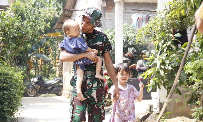Salah satu momen mengharukan terekam saat Pratu Wahyu, anggota Satgas TMMD 125 dari Yonzipur 11/DW Kodam Jaya, tampak menggendong seorang balita bernama Fauzan (2 tahun) dan memapah Elisa (4 tahun), anak-anak warga RT 01 RW 06 Kelurahan Mustikasari.