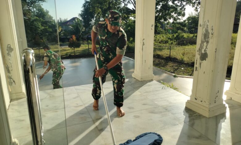 Kegiatan gotong royong membersihkan Masjid Baitul Muna oleh prajurit TNI, dengan menyapu daun kering, mengepel lantai, hingga membersihkan kaca jendela, agar rumah ibadah tersebut kembali bersih dan nyaman digunakan masyarakat.