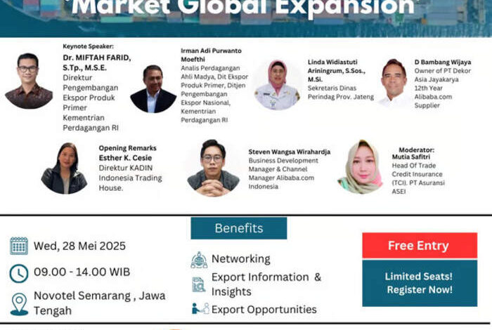 Jakarta, 21 Mei 2025 – Kabar gembira bagi para pelaku ekspor, Kadin Indonesia Trading House kembali hadir dengan workshop interaktif yaitu Exporter Meet Up 2025: Global Market Expansion. Kegiatan kali ini akan hadir di Semarang, sebuah forum eksklusif yang dirancang untuk membuka wawasan dan peluang ekspansi pasar global bagi para eksportir. Acara ini akan diselenggarakan pada Rabu, 28 Mei 2025, pukul 09.00 – 13.00 WIB di Novotel Semarang, Jawa Tengah