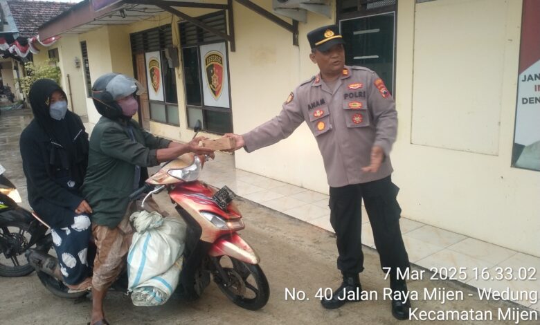 DEMAK || Koranprogresif.id – Kapolsek Mijen, Polres Demak, AKP Khairul Anam, SH bersama Wakapolsek Iptu Moh Alim dan jajaran membagikan Takjil menjelang buka puasa di depan Kantor Polsek dan sekitar wilayah Mijen, Jum’at (7/3).