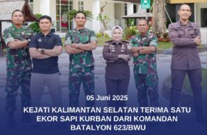 Diterangkan oleh Kasi Penkum Kejati Kalsel, Yuni Priyono, SH, MH bahwa, penyerahan hewan kurban ini merupakan bentuk sinergi dan kepedulian sosial antar institusi, serta bagian dari upaya memperkuat hubungan silaturahmi antara Kejaksaan dan TNI, khususnya di wilayah Kalimantan Selatan.