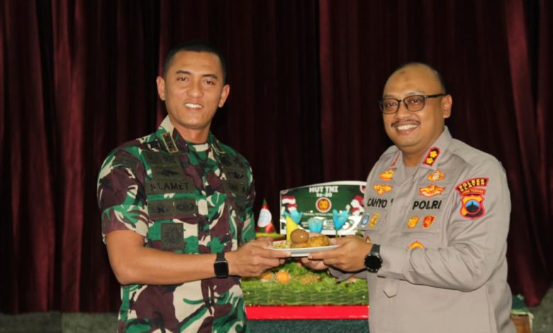 KLATEN – Bertempat di Makodim 0723/Klaten, berlangsung kegiatan pemberian ucapan selamat Hari Ulang Tahun (HUT) ke-80 Tentara Nasional Indonesia (TNI) Tahun 2025 dari jajaran Polres Klaten kepada Kodim 0723/Klaten, Kamis (9/10/2025). Kegiatan tersebut berlangsung dengan penuh kebersamaan dan menjadi wujud nyata sinergitas antara TNI dan Polri di wilayah Kabupaten Klaten.