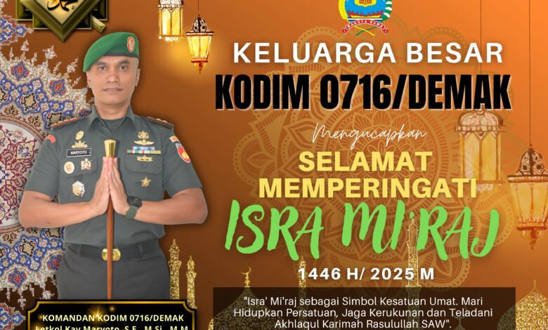 Untuk itu, Komandan Kodim 0716/Demak, Letkol Kav Maryoto, S.E, M.Si, M.M, beserta keluarga besar Kodim 0716/Demak mengucapkan selamat memperingati Isra’ Mi’raj 1446 H, kepada seluruh umat muslim khususnya di Kabupaten Demak.