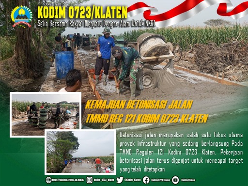 Klaten || Koranprogresif.id, Betonisasi jalan merupakan salah satu fokus utama proyek infrastruktur yang sedang berlangsung Pada TMMD Reguler 121 Kodim 0723 Klaten. Pekerjaan betonisasi jalan terus digenjot untuk mencapai target yang telah ditetapkan. (17/08/2024)