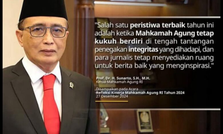 JAKARTA || Koranprogresif.id – Dalam Refleksi Akhir Tahun 2024 Mahkamah Agung yang digelar pada Jum’at (27 Desember 2024), Ketua Mahkamah Agung, YM Prof Dr Sunarto, SH, MH menyampaikan banyak hal yang perlu dicermati dan dipahami tentang pemberitaan di lingkungan Mahkamah Agung dan Peradilan.